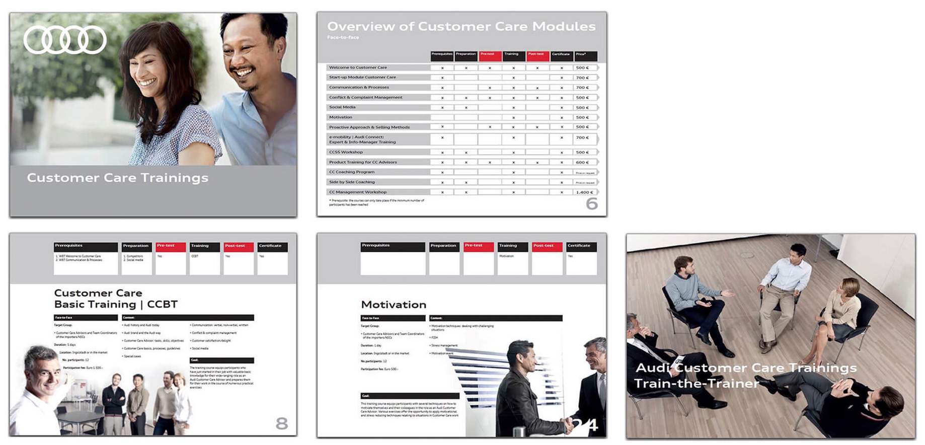 Plakative „Broschüre“ für das umfassende Trainingsangebot der internationalen Kundenbetreuung (AUDI AG).